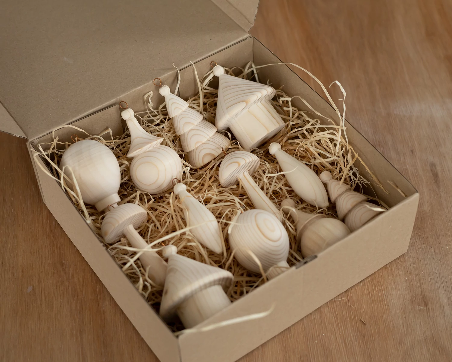 Ez a 12 darabos, kézzel esztergált karácsonyfadísz szett tömör fenyőfából készült, és kreatív alkotásra hív mindenkit. A díszeket lehet kifesteni bármilyen festékkel, de natúran is szépen mutatnak a fán.