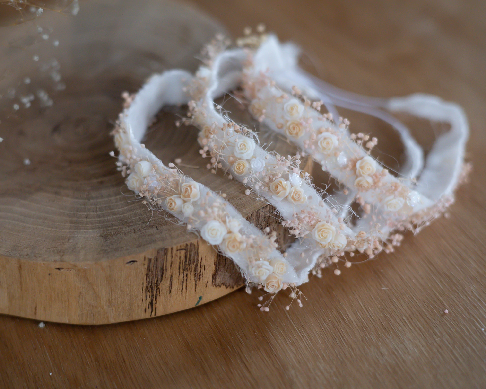 Koszorú jellegű fejpánt, hátul rugalmas. 0-2 hónapos méret, újszülött fotózáshoz készült.