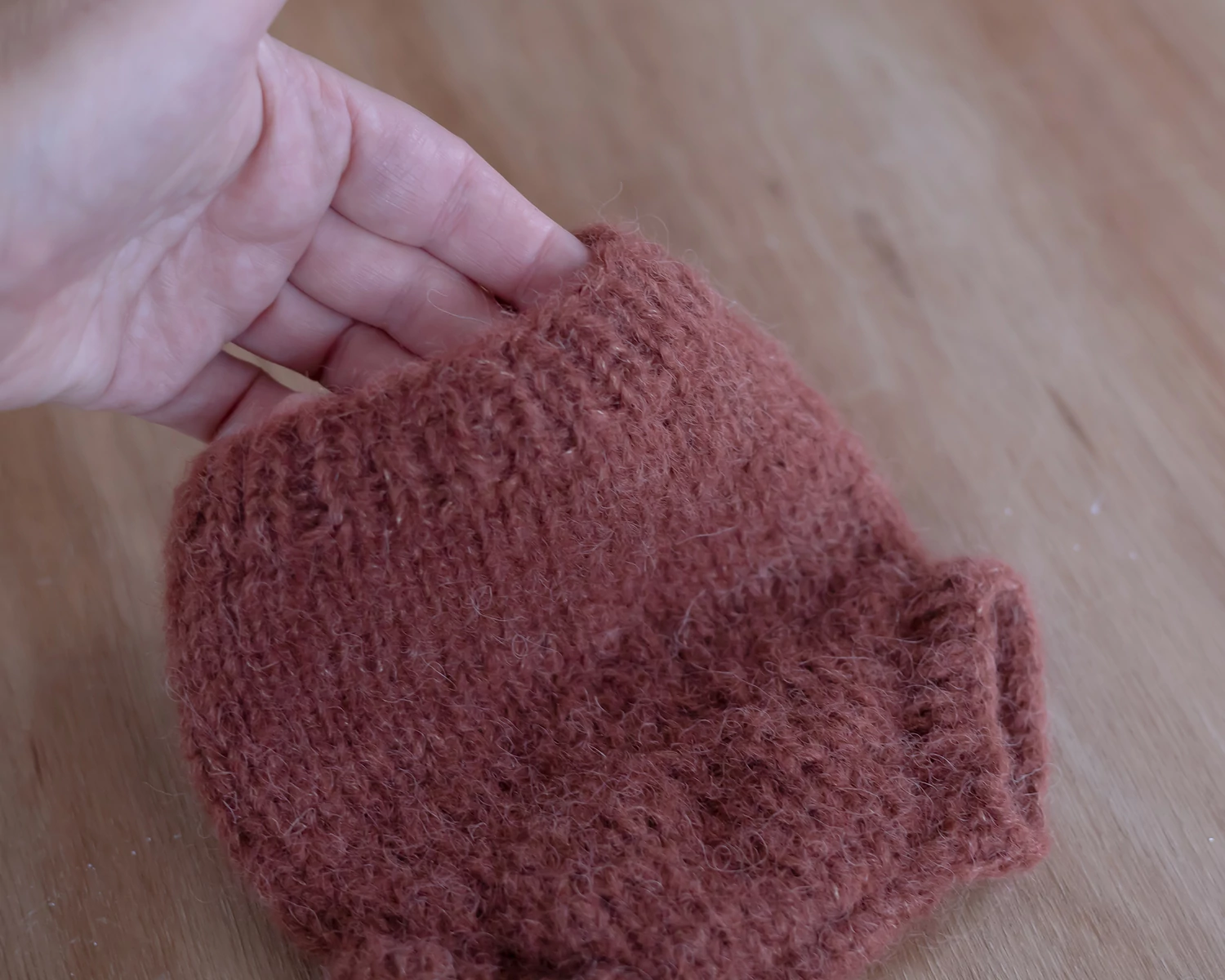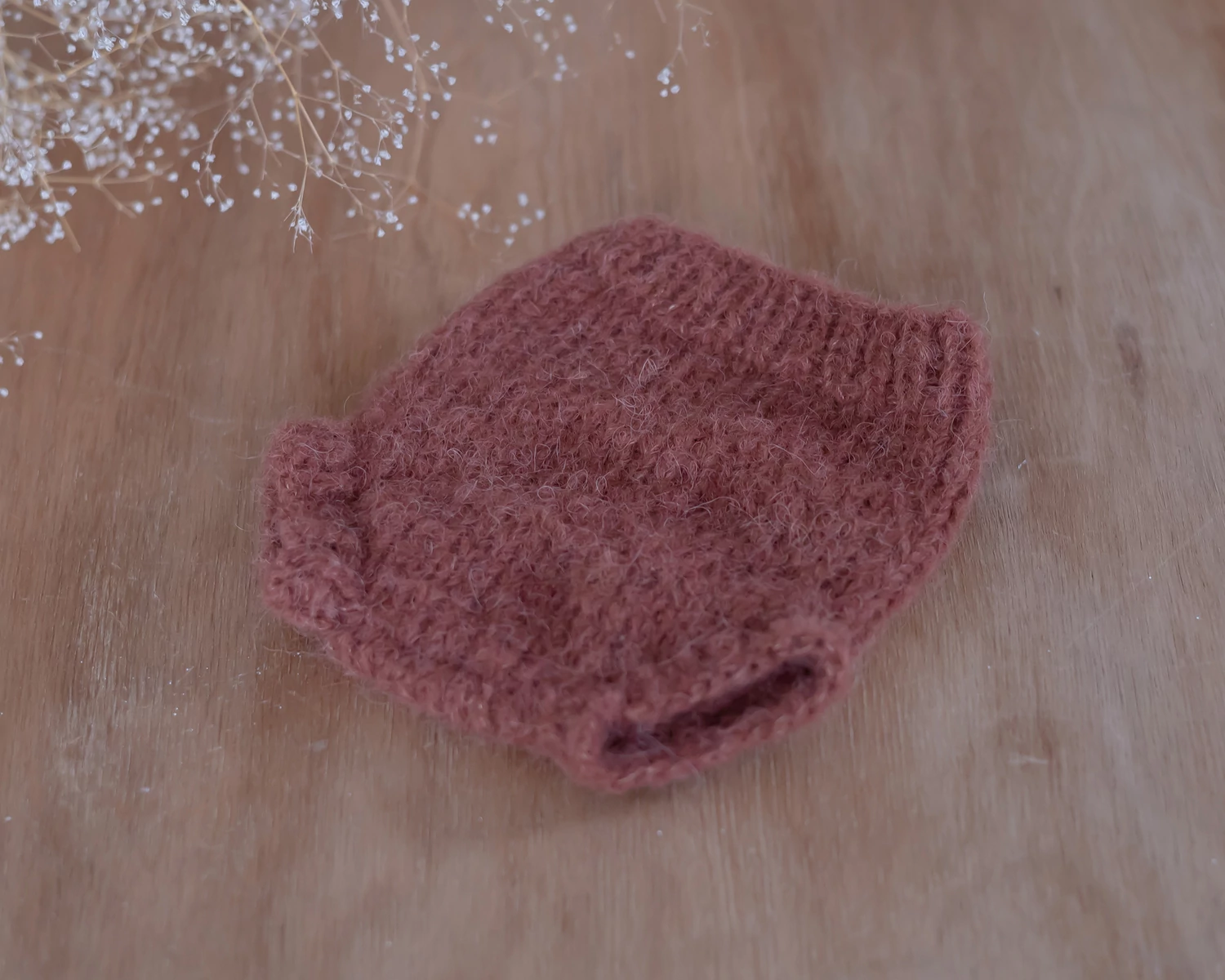 Kötött bugyika, rövid szárú, 0-3 hónapos méret, fotózáshoz rozsda színben, minőségi gyapjú fonalból, kézzel kötött.