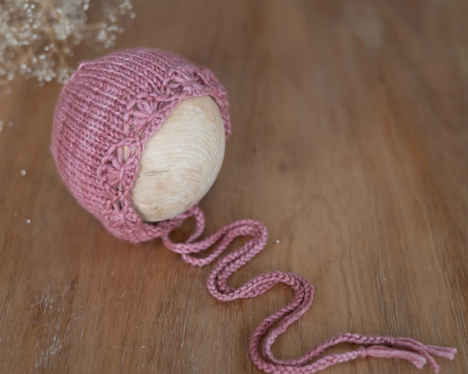 Kézzel festett fonalból készült, kötött, bonnet fazonú sapka, újszülött méretben babafotózáshoz