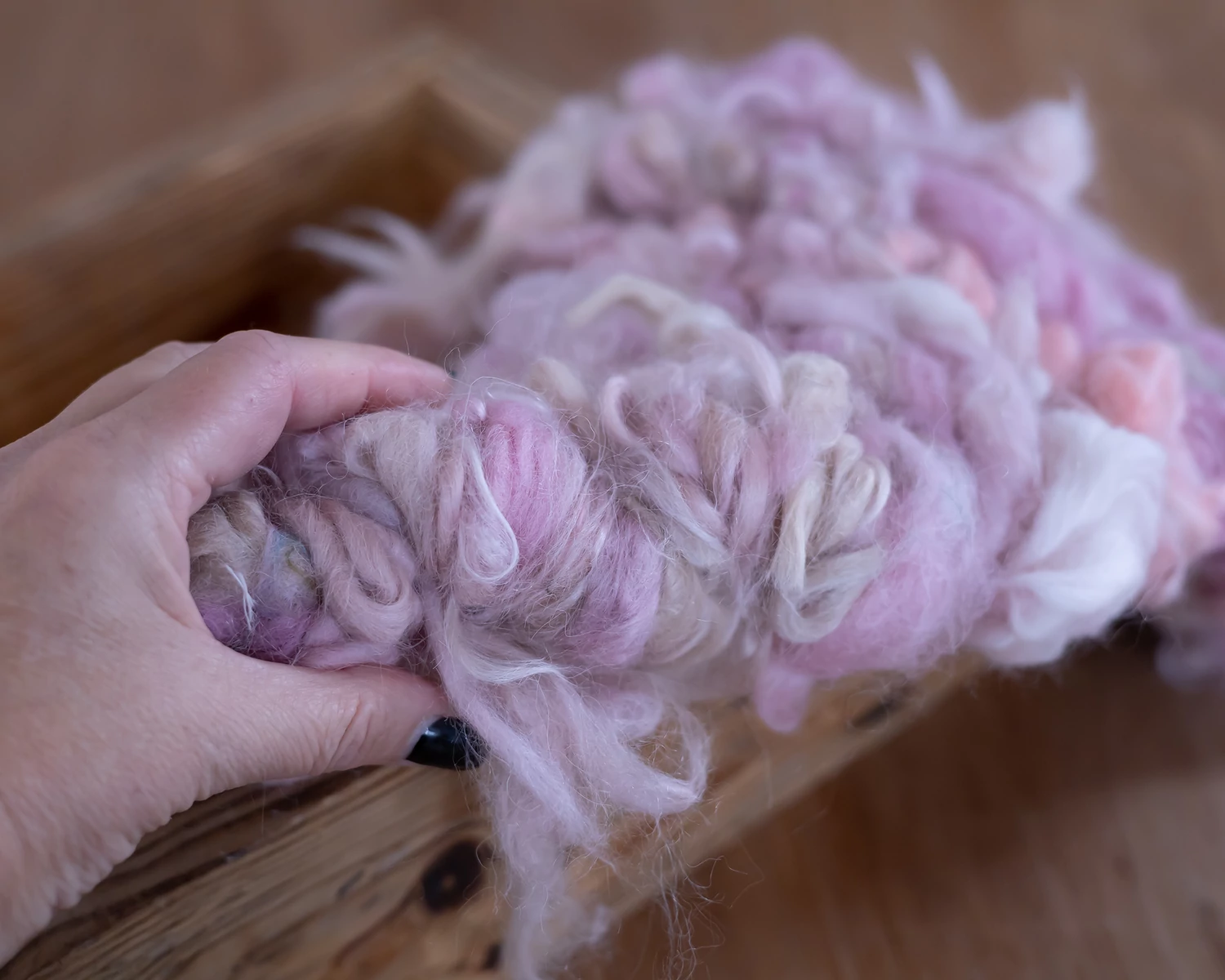 Kézzel készült mini gyapjú alátét rózsaszín és krém árnyalatban. Lágy, rusztikus textúrája tökéletesen kiemeli az újszülötteket, főként lányos fotózásokhoz ajánlom. Kosárban, ágyikóban és lifestyle beállításokban is ideális.