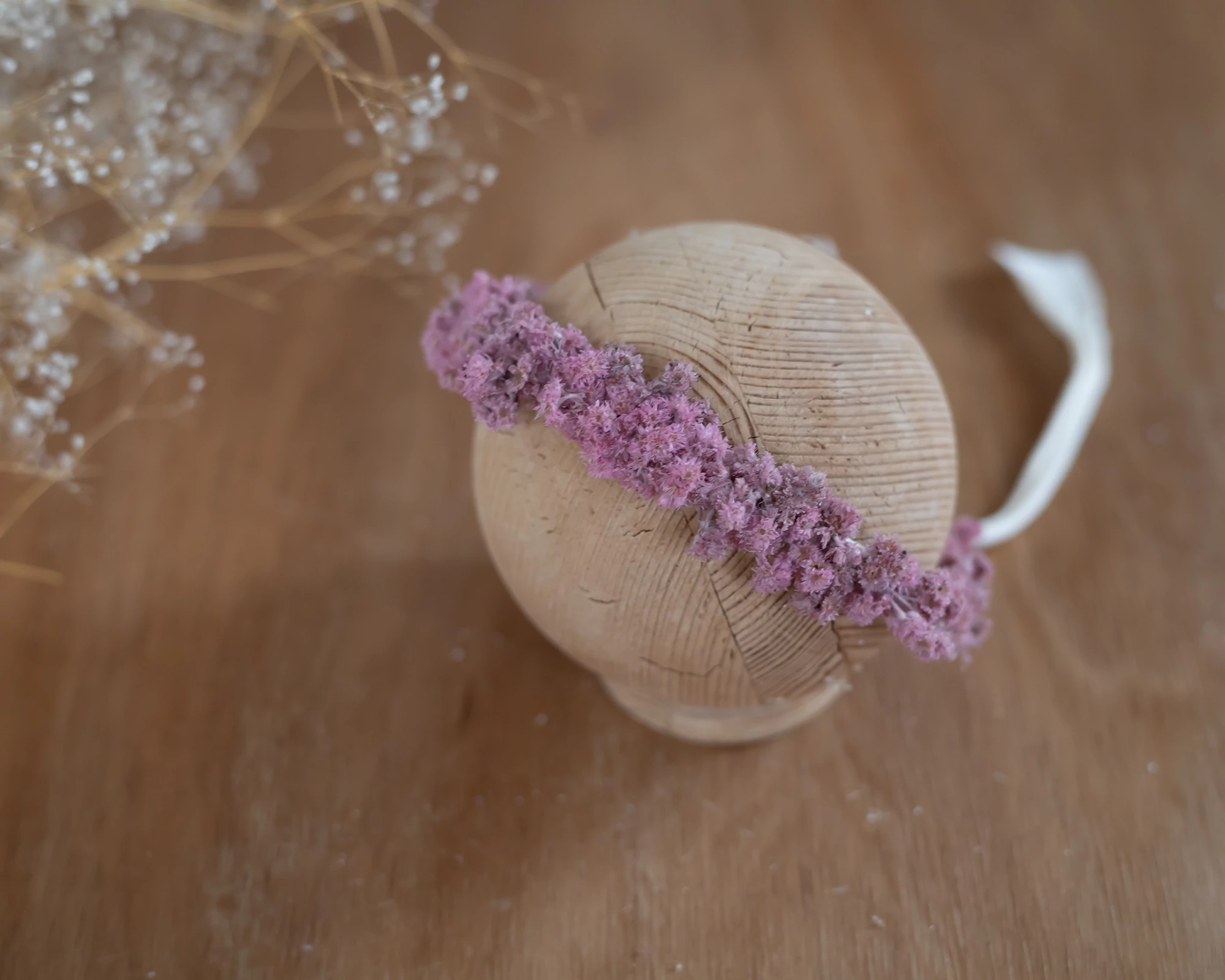 Kézzel készült, koszorú jellegű fejpánt mályva árnyalatban. Hátul rugalmas, megkötős pánttal készült, így újszülött kortól felnőtt korig kényelmesen használható.