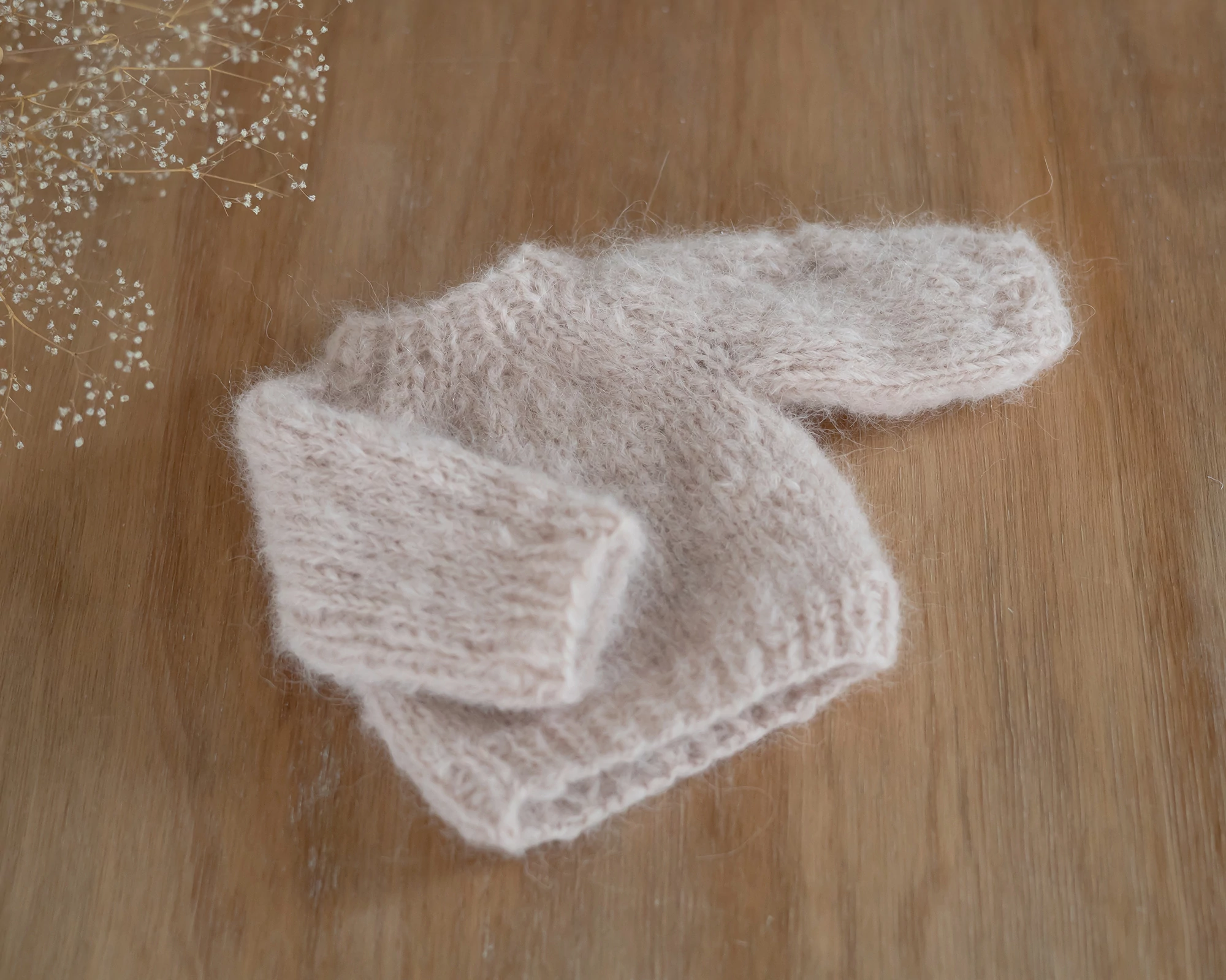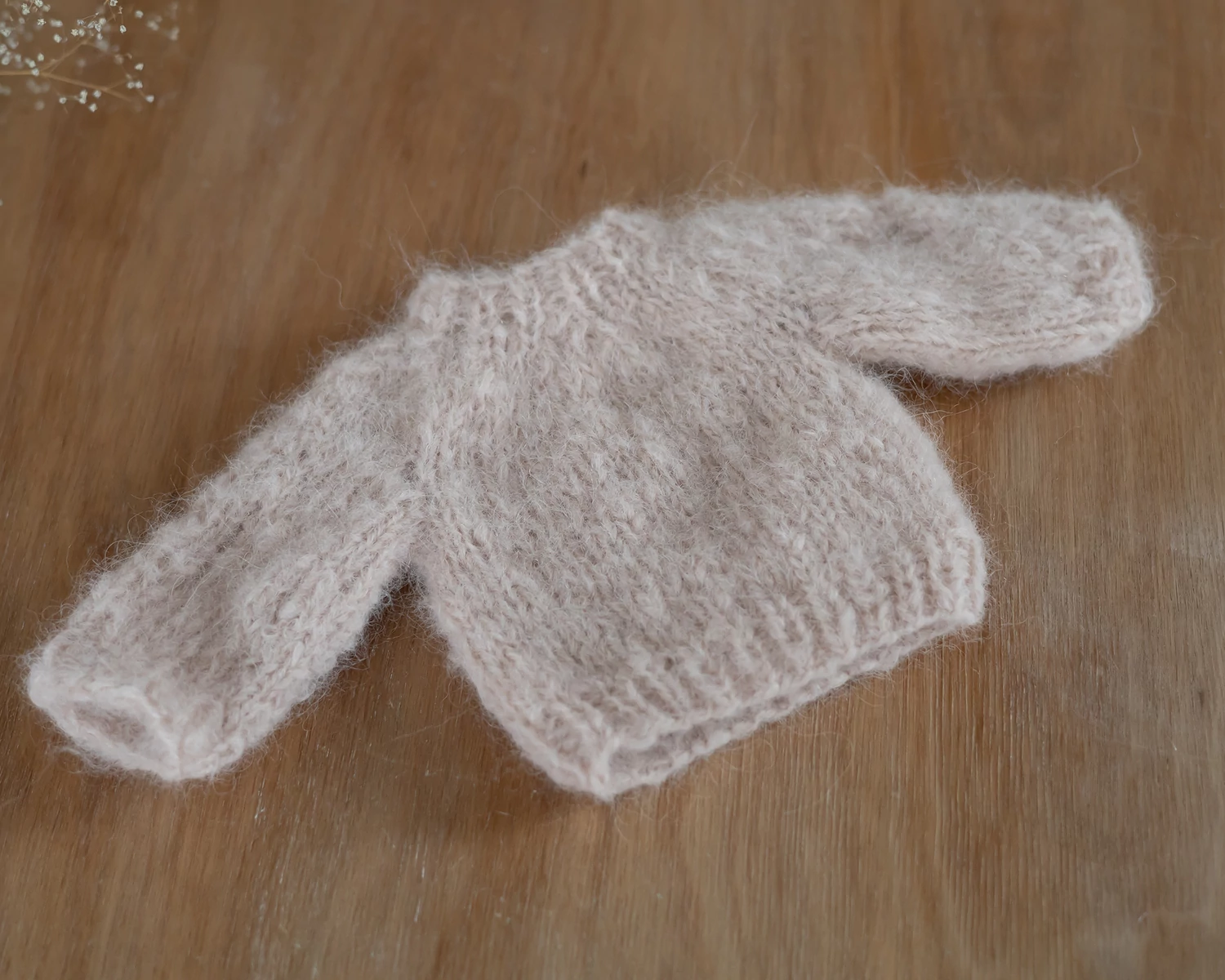 RENDELHETŐ Púder rózsaszín, mohair, kézzel kötött újszülött pulóver