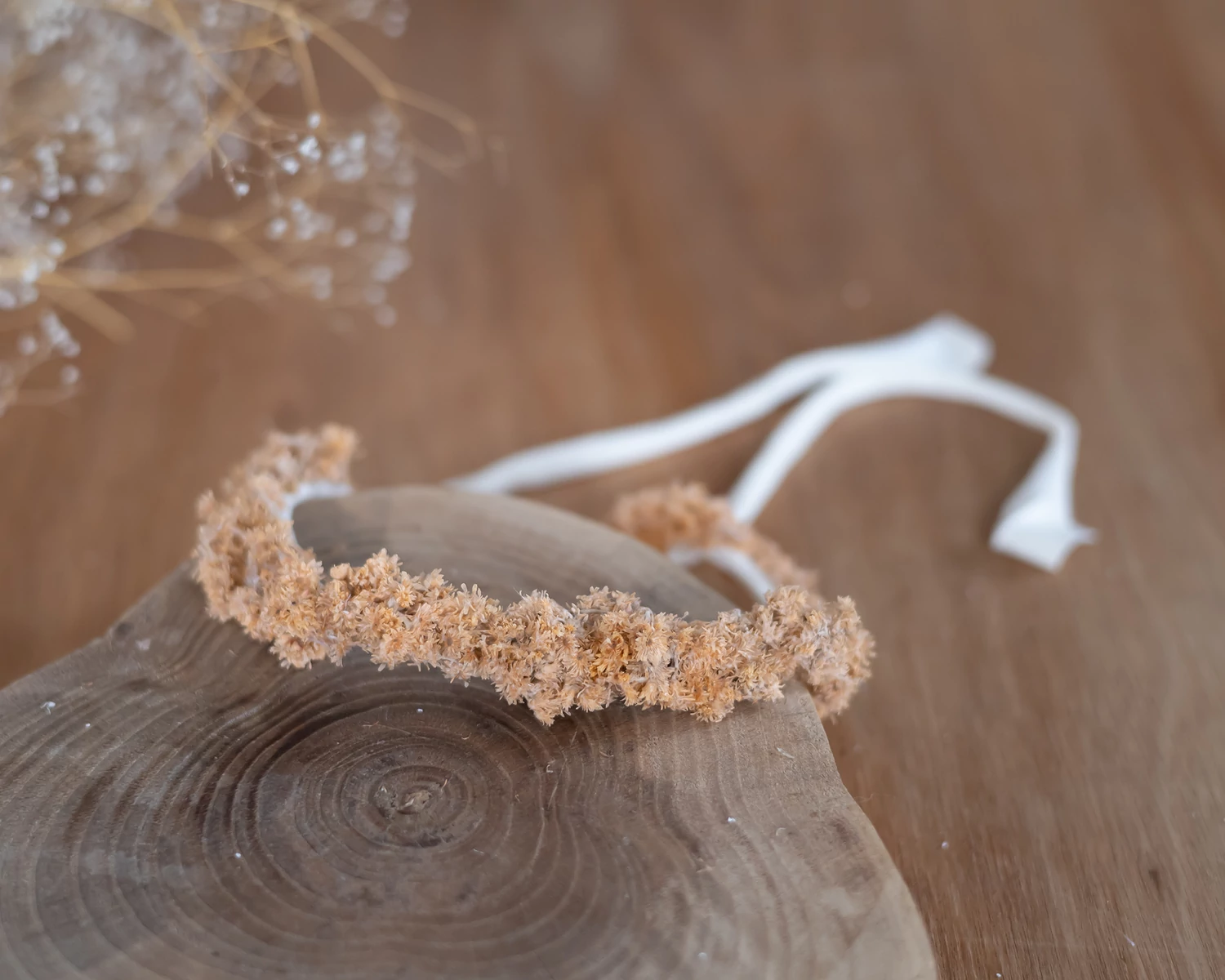 Koszorú jellegű, rugalmas megkötővel ellátott fejpánt, univerzális méret újszülöttől felnőtt korig. Meleg, árnyalata különleges őszi vagy vintage hangulatot ad a fotózásokhoz. Ideális újszülött és gyermek fotózáshoz, esküvőre vagy családi eseményekre.